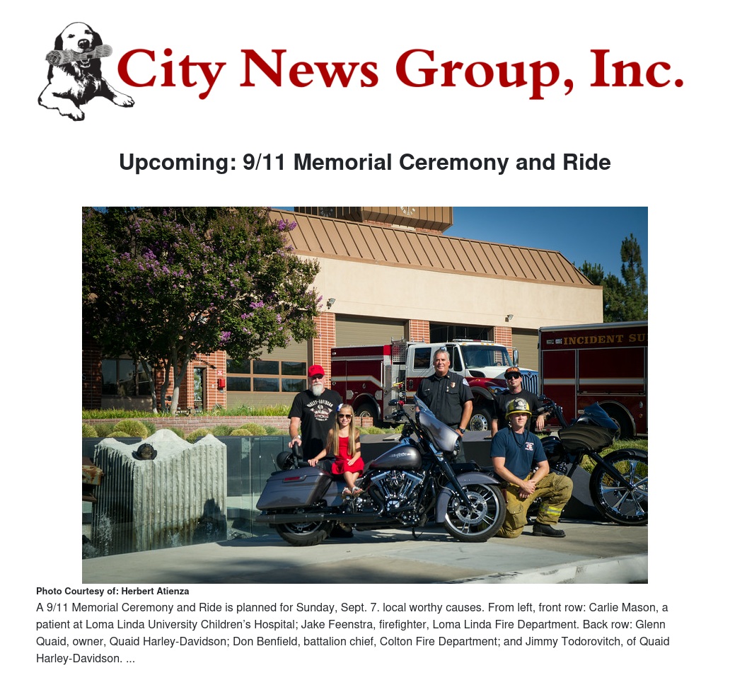 Leading up to the ceremony, Quaid Harley-Davidson and Loma Linda H.O.G. will host a 9/11 Memorial Ride that will travel in procession through the city of Loma Linda to the 9/11 Memorial Ceremony.