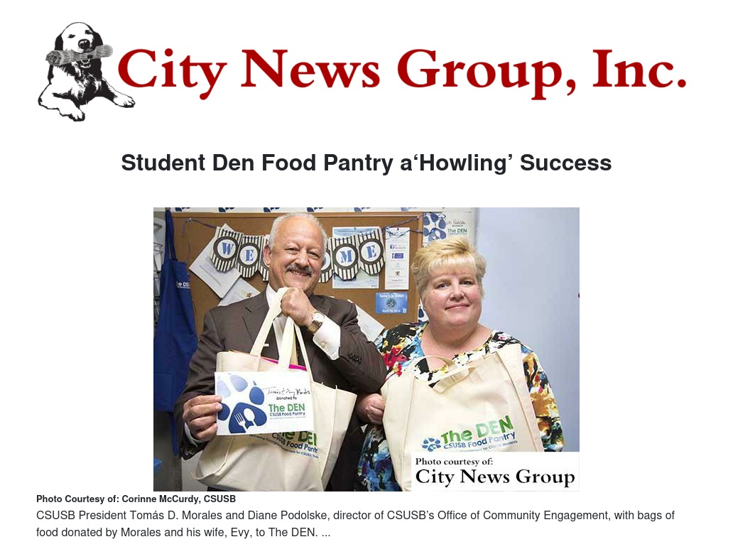 For more information, call Bryant Fairley at 909-537-7347 and visit the Office of Community Engagement DEN CSUSB Food Pantry website at http://engage.csusb.edu/TheDENFoodPantry.htm.