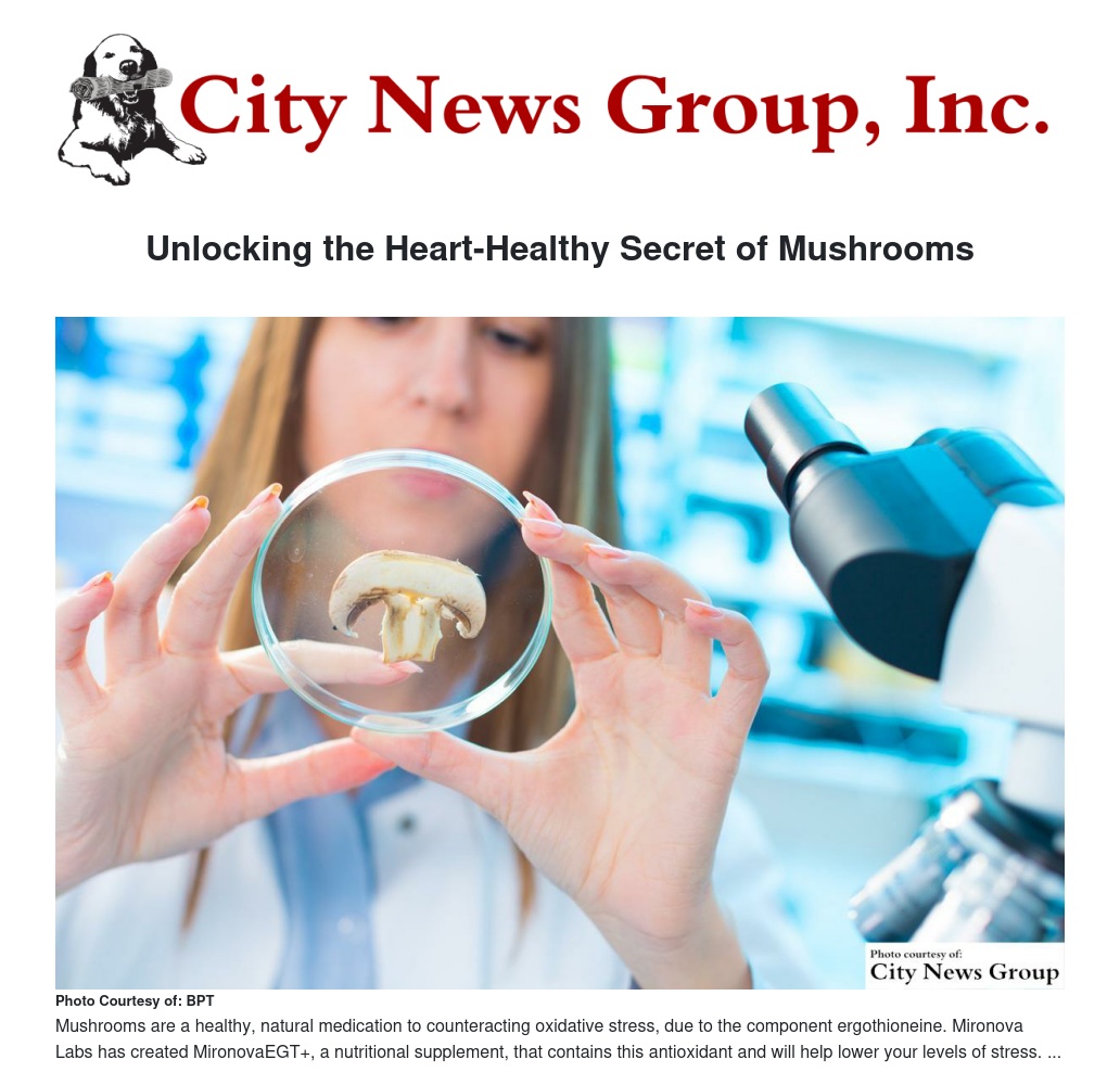 Thanks to a scientific breakthrough by Mironova Labs, it is now possible to harness the power of this super antioxidant in a nutritional supplement. MironovaEGT+ is the first and only supplement to concentrate ergothioneine into an affordable, daily serving to help protect your heart from the damaging effects of oxidative stress.*