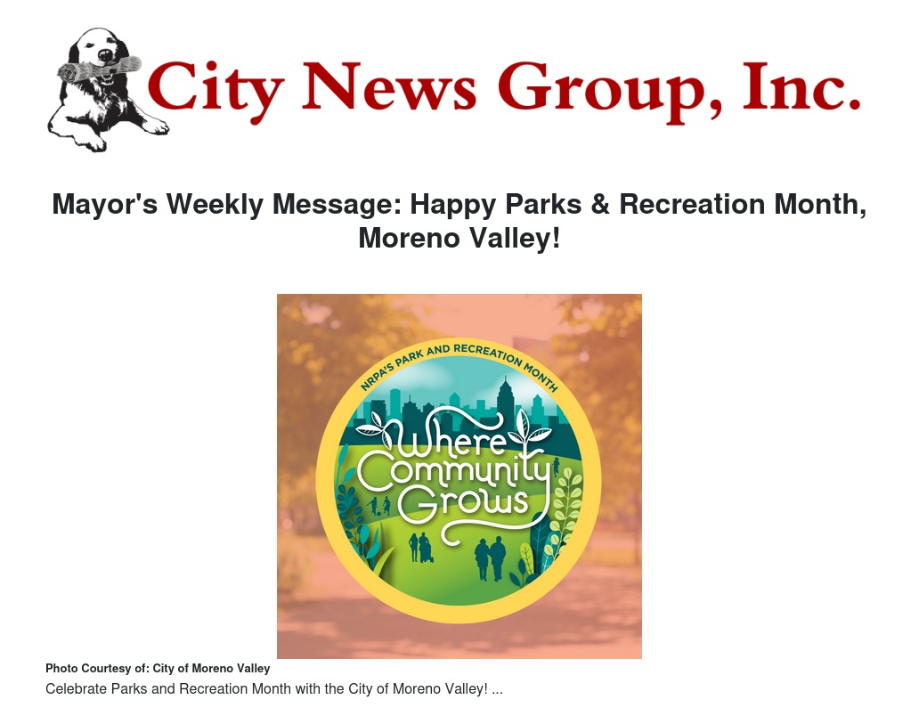 This month, I encourage you to spend a day in one of our parks and trails and check out all the exciting programs and services that make Moreno Valley a great place to live.