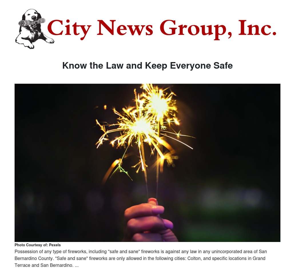 While “Safe and Sane” fireworks are allowed in some San Bernardino County communities, the County Board of Supervisors and SBCoFD encourage residents to watch fireworks at community celebrations rather than use their own. Visit sbcfire.org for a schedule of local firework displays.