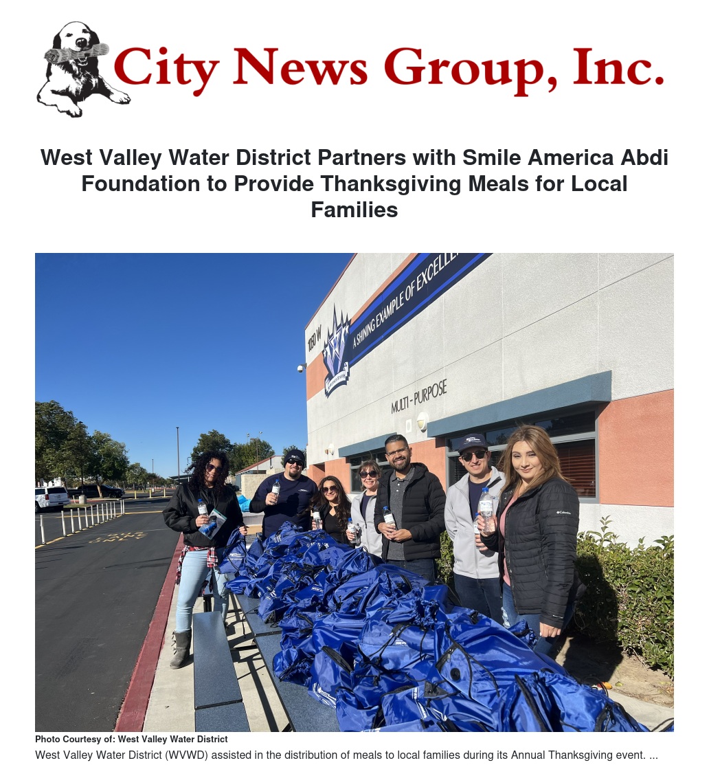 West Valley Water District (WVWD) partnered with the Smile America Abdi Foundation (SAAF), to assist with the distribution of meals to local families during its Annual Thanksgiving Drive event.