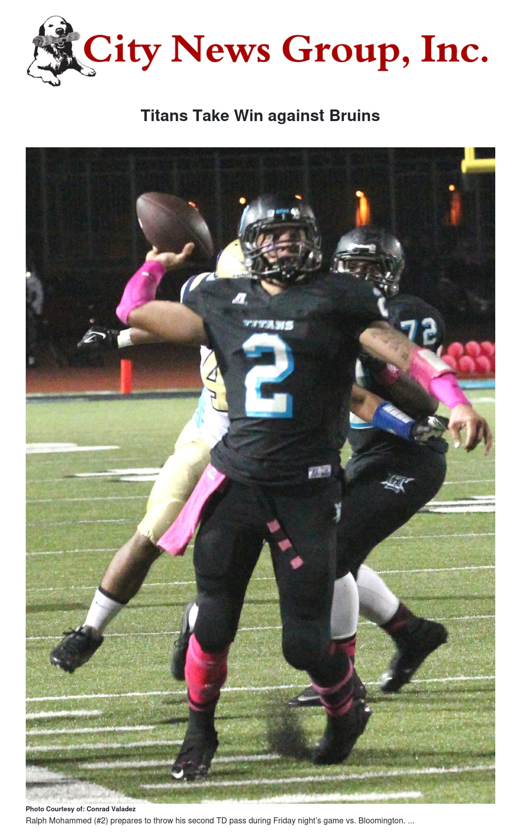 The GTHS Titans cruised their way to a 44–30 victory over Bloomington High School (BHS) in the first Sunkist League game for both schools on Friday night, Oct. 11. Behind six touchdowns by Cruz Duke (#21), the Titans overcame an early deficit to avenge last season’s loss to the Bruins.