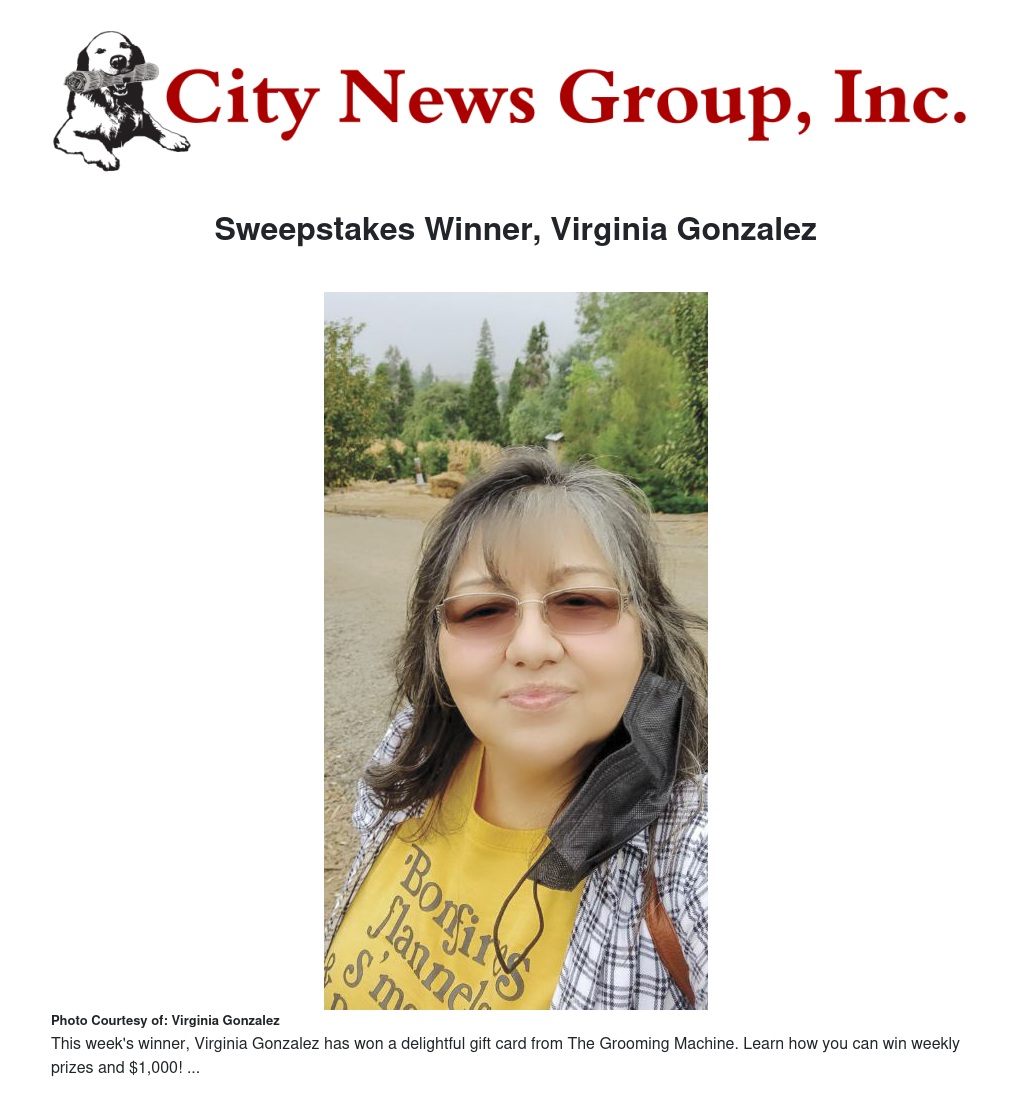 Virginia Gonzalez is this week’s winner of the sweepstakes giveaway! As this week’s winner of the weekly prize giveaway, Gonzalez has won a gracious gift card provided by local business, The Grooming Machine.