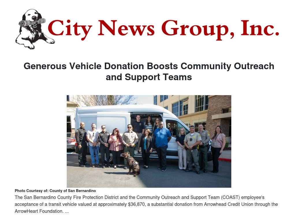 The San Bernardino County Fire Protection District (SBCoFD) is proud to announce the acceptance of a transit vehicle valued at approximately $36,870, a substantial donation from Arrowhead Credit Union through the ArrowHeart Foundation. This generous contribution will significantly enhance the operations of the Community Outreach and Support Team (COAST) program.