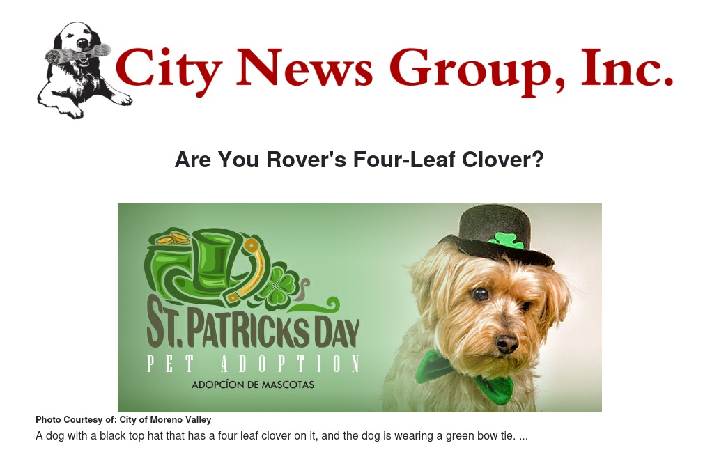 Make a lucky pet’s day at the Moreno Valley Animal Shelter during the St. Patrick’s Day Pet Adoption Event!