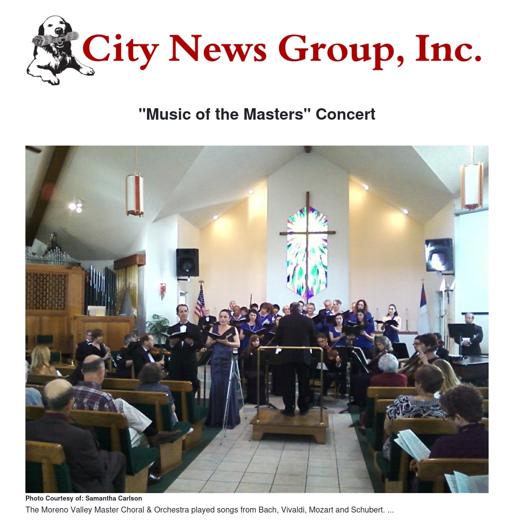Guests gathered at Shepherd of the Valley Lutheran Church in Moreno Valley on Sunday April 6th, to listen to classical works performed by, The Moreno Valley Master Chorale & Orchestra who presented the concert, “Music of the Masters” featuring soloists, Camelia Voin, Maribel Ruiz-Velasco and Steven Hinde.