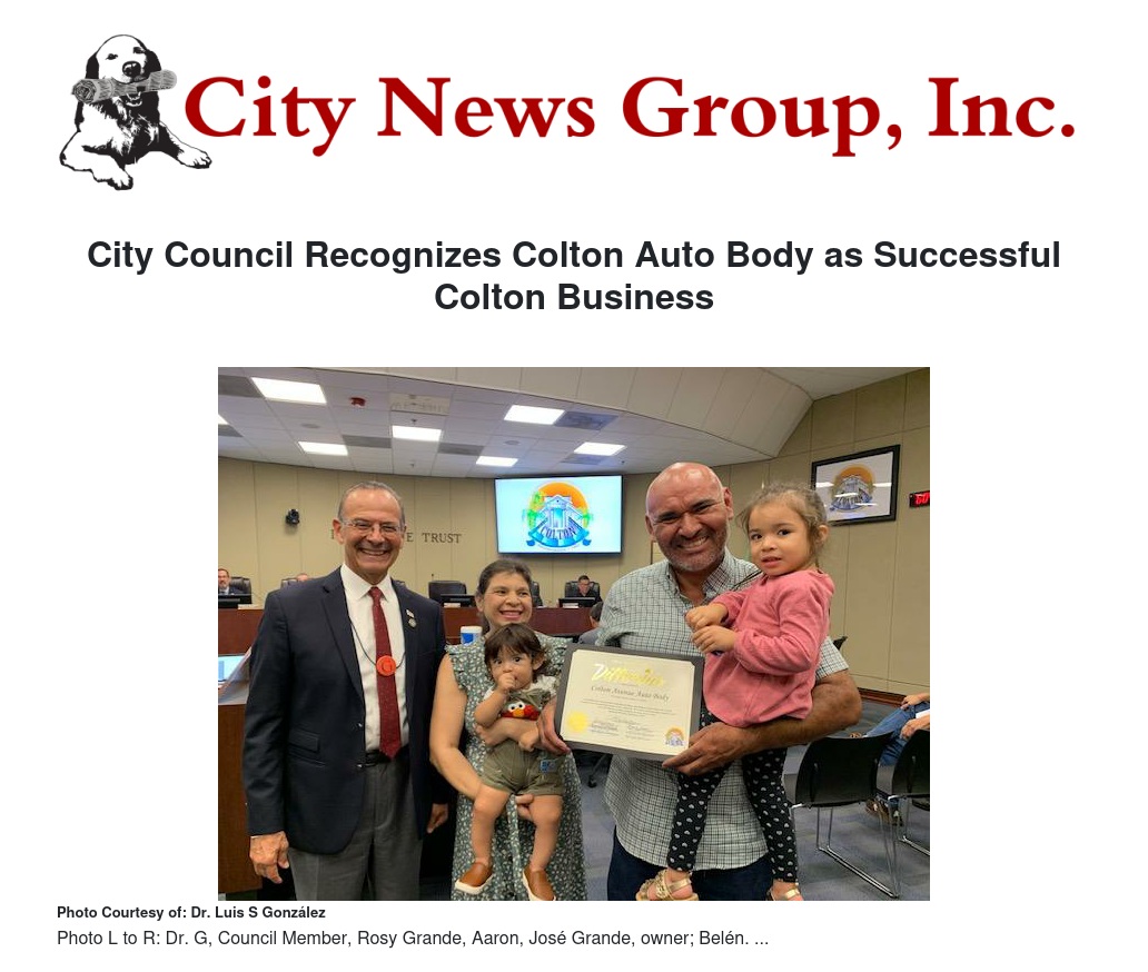 City Council Recognizes Colton Auto Body as Successful Colton Business by Dr. Luis S González - City News Group, Inc.