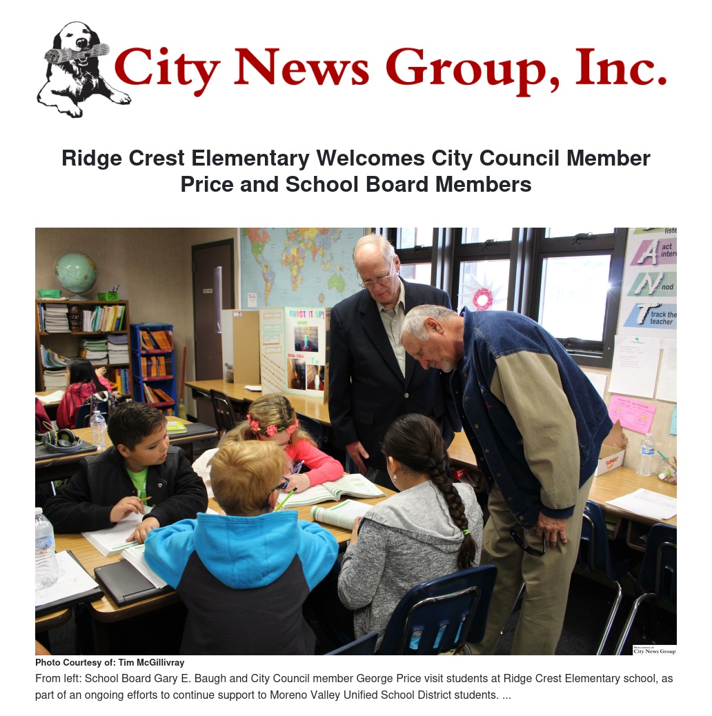 MORENO VALLEY >> In their continuing effort to work collaboratively to support Moreno Valley children, School Board members Gary E. Baugh and Patrick Kelleher joined City Council member George Price this week for a tour of Ridge Crest Elementary, which is in Council member Price’s district.