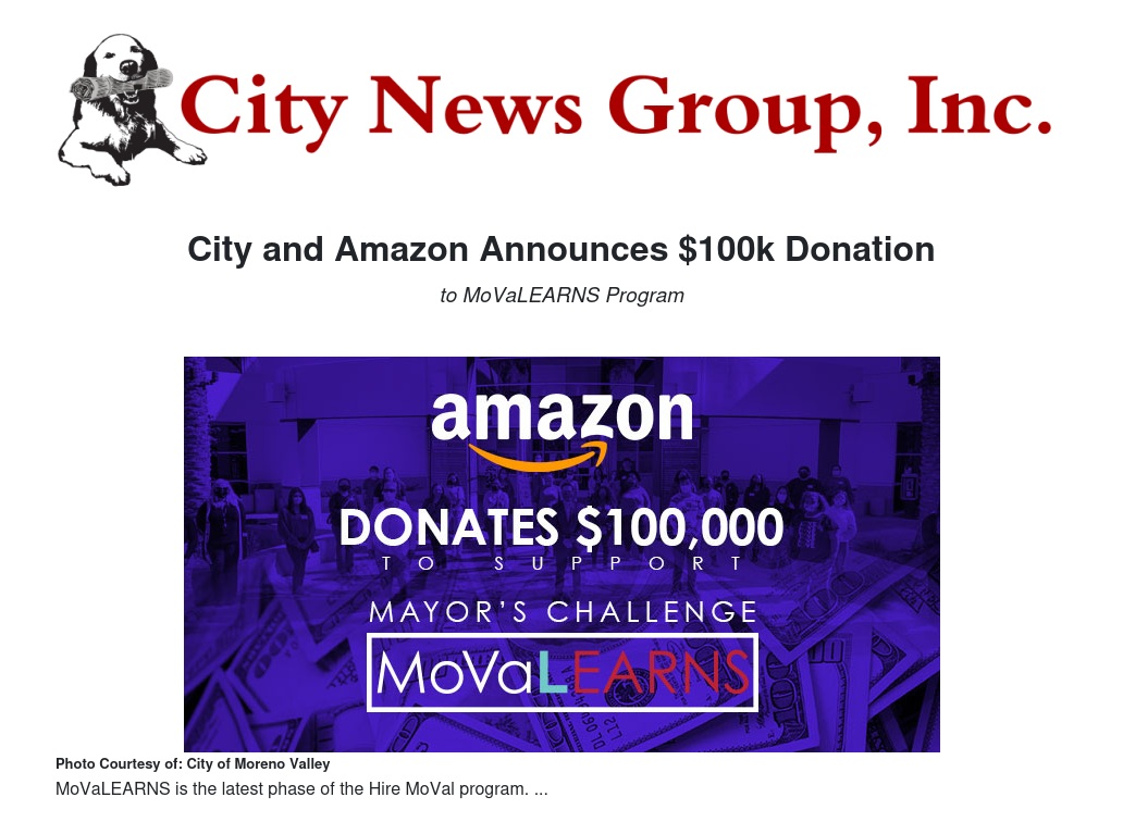 The City of Moreno Valley is pleased to announce a $100,000 donation from Amazon to the City’s MoVaLEARNS program. This generous donation will fund a full year of the MoVaLEARNS program through the Moreno Valley Community Foundation.