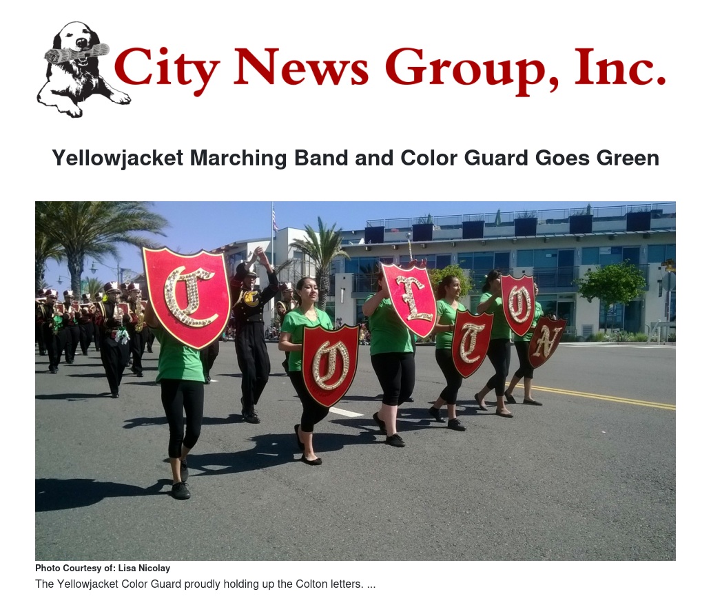 The Colton High School (CHS) "Yellowjacket" Marching Band and Color Guard recently participated in the 20th Annual St. Patrick's Day Parade in Hermosa Beach.