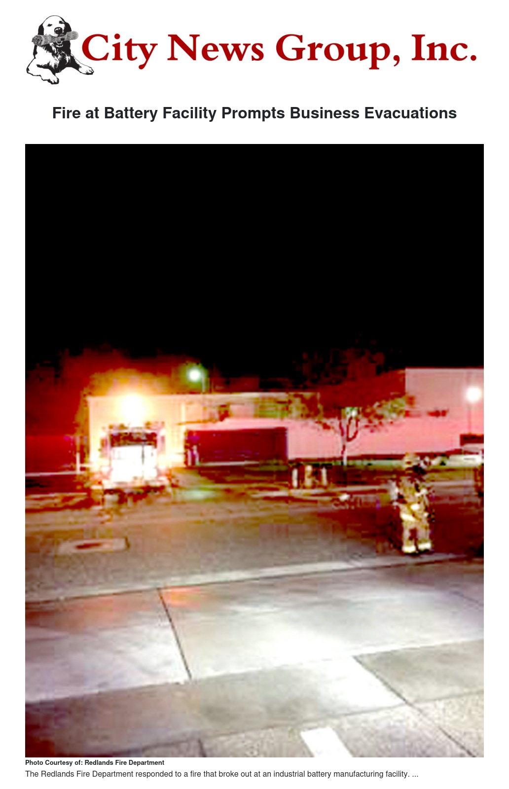 The Redlands Fire Department responded Tuesday evening to a fire at an industrial battery manufacturing facility located at 840 W. Brockton Avenue.
