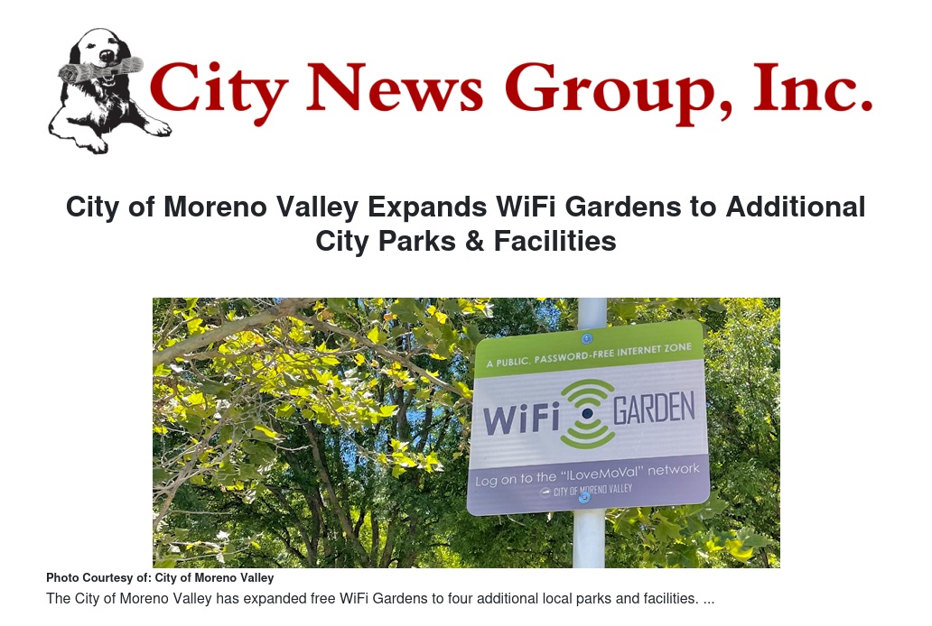 The City of Moreno Valley has expanded free WiFi Gardens to four additional local parks and facilities—Bayside Park, Moreno Valley Community Park, and the Towngate Community Center in District 1, as well as Patriot Park in District 4.