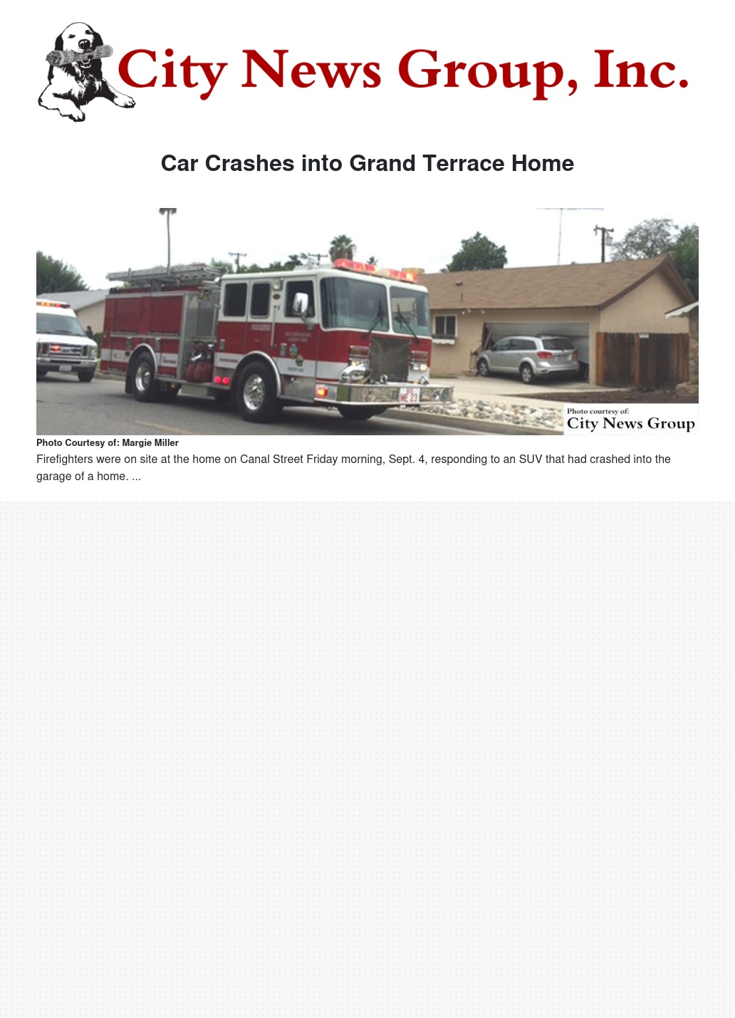 Grand Terrace police, firefighters and city officials were on scene the Friday morning before the Labor Day holiday investigating how and why an SUV with one occupant crashed into the garage of a home on Canal Street, damaging the garage's steel door, stucco around the garage and impacting a vehicle inside the garage.