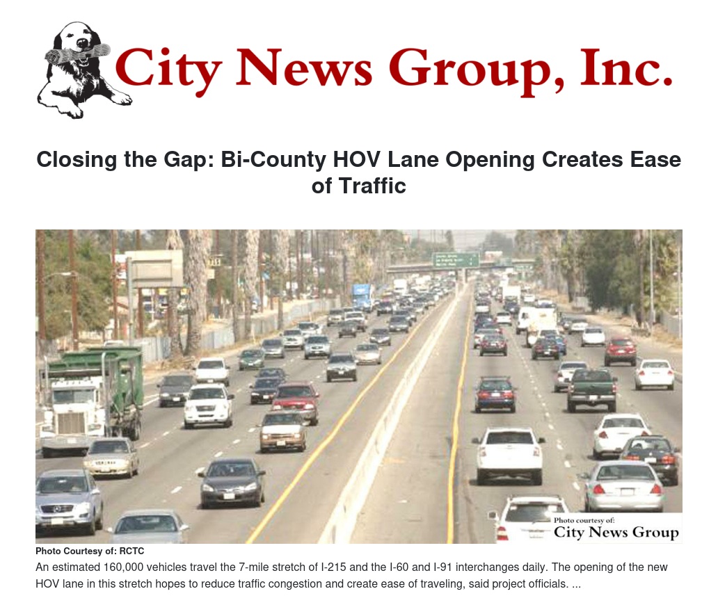 The HOV lane opening also precedes two separate, related projects on this section of the 215 freeway: the reconstruction of the Mt. Vernon/Washington Street interchange in Colton, and the Barton Road interchange in Grand Terrace.