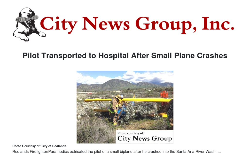 Redlands firefighter/paramedics extricated the pilot of a small biplane after he crashed into the Santa Ana River Wash in the eastern portion of Redlands last week.