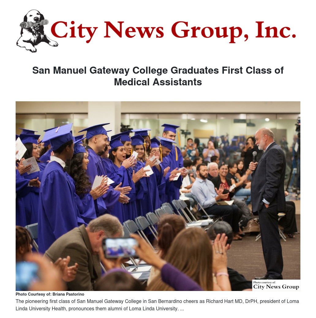 ALL>> The first class to receive a Loma Linda University education in the city limits of San Bernardino was presented with certificates during a graduation ceremony on Thursday, June 7. Twelve students received medical assistant certificates, and 22 received certification as community health workers from San Manuel Gateway College.