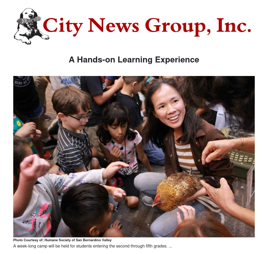 The Humane Society of San Bernardino Valley is hosting its annual “Critter Camp” – a week-long, interactive, learning experience for students entering the second, third, fourth and fifth grades. The camp will be held July 22-26, from 8:30 a.m. to 12:30 p.m.