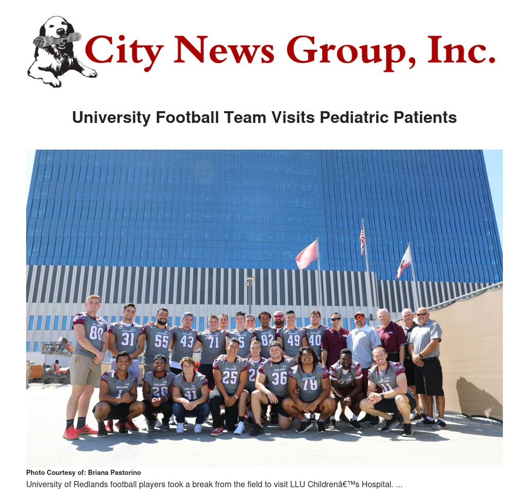 Loma Linda University Children’s Hospital patients were treated to a visit from members of the University of Redlands football team on Thursday, August 29.