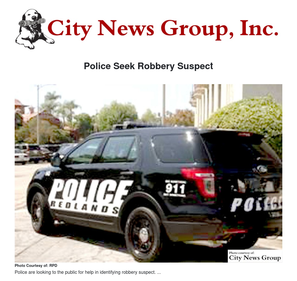 Detectives have released surveillance video from the Redlands robbery in an effort to identify the suspect. The video may be viewed on the Redlands Police Department’s YouTube Channel at http://youtu.be/IFW0kGOFD2A.