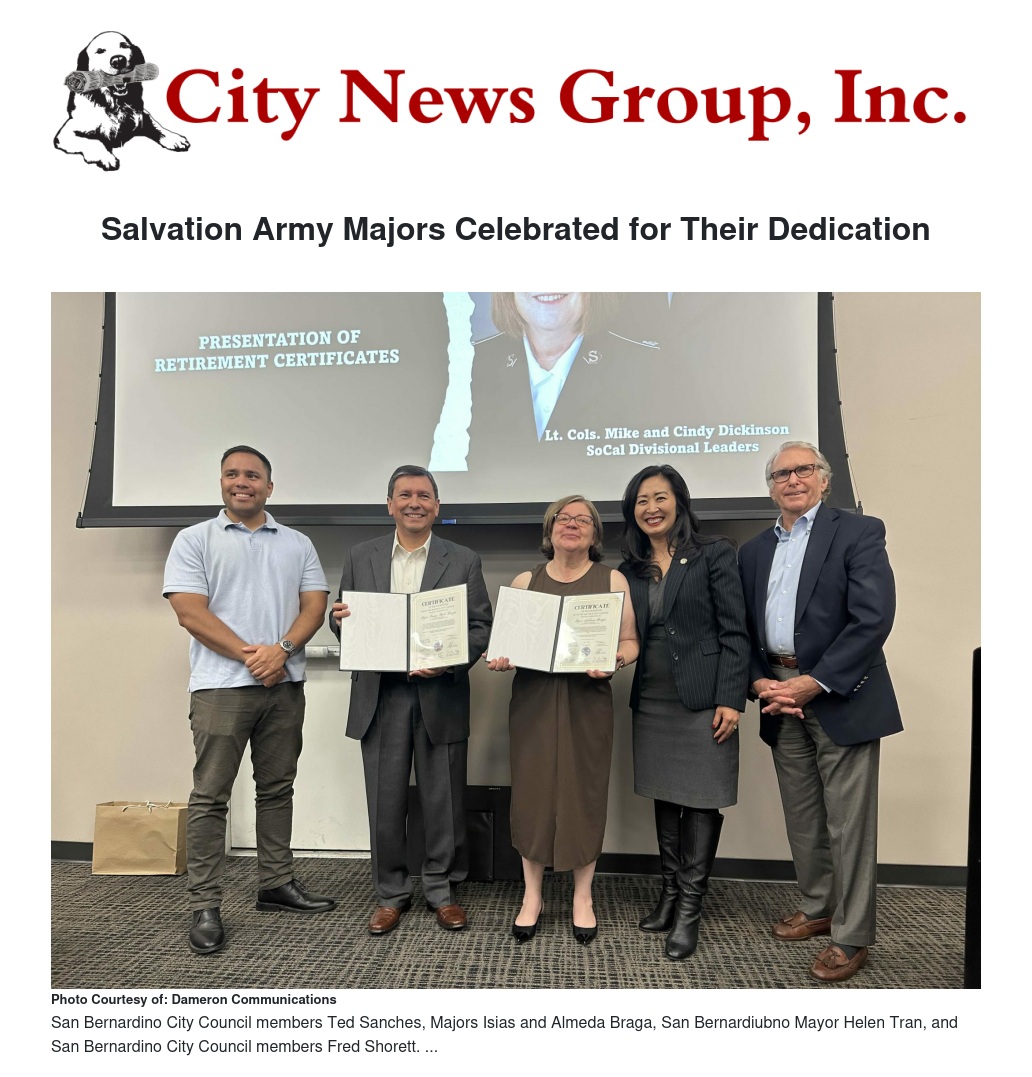 The occasion also featured members of the Salvation Army Advisory Board, Cindy Amrine, of Ground Hog, Inc., Carl M. Dameron of Dameron Communications, and Brian Cronin, retired, Fred Shorett, Dr. Rachel Weiss, Dean of Grants Development and Administration, Riverside Community College, who gathered to honor the Bragas and reflect on their legacy. The event was filled with heartfelt tributes, showcasing the impact of their service and dedication.