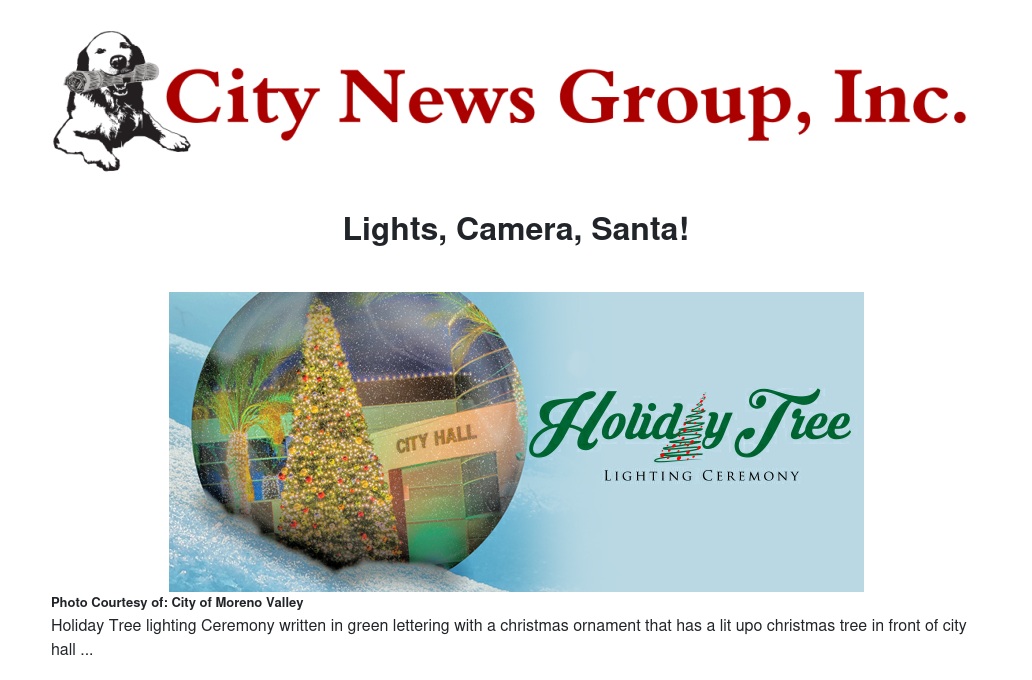 On Saturday, December 6, City Hall transformed into a magical, musical, winter wonderland as hundreds of residents joined the Mayor and City Council to light up Moreno Valley's 30-foot-tall tree at the annual Holiday Tree Lighting Ceremony!