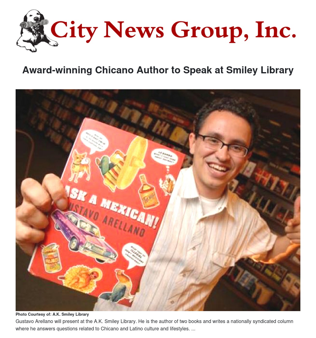 Award-winning Chicano author Gustavo Arellano will give a free speech at the A.K. Smiley Library Assembly Room on Thursday, Oct. 10, at 6:30 p.m. Mr. Arellano is the editor of OC Weekly, an alternative newspaper in Orange County, Calif., author of “Orange County: A Personal History” and “Taco USA: How Mexican Food Conquered America,” and lecturer with the Chicana and Chicano Studies department at California State University, Fullerton.