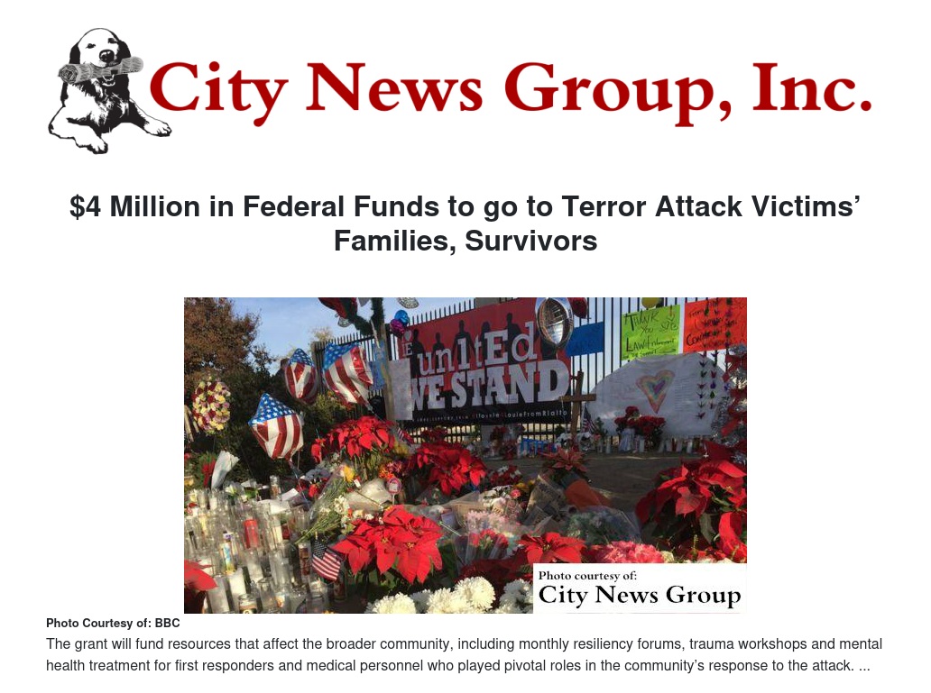 The funds were disbursed through the DOJ’s Anti-Terrorism and Emergency Assistance Program (AEAP) to the California Victim Compensation Board, which will reimburse San Bernardino County for expenses and projects funded by the grant. The grant will help pay for services for survivors and family members including, medical leave, COBRA reimbursement, lost income, mental health care, medical expenses, funeral expenses and rehabilitation.