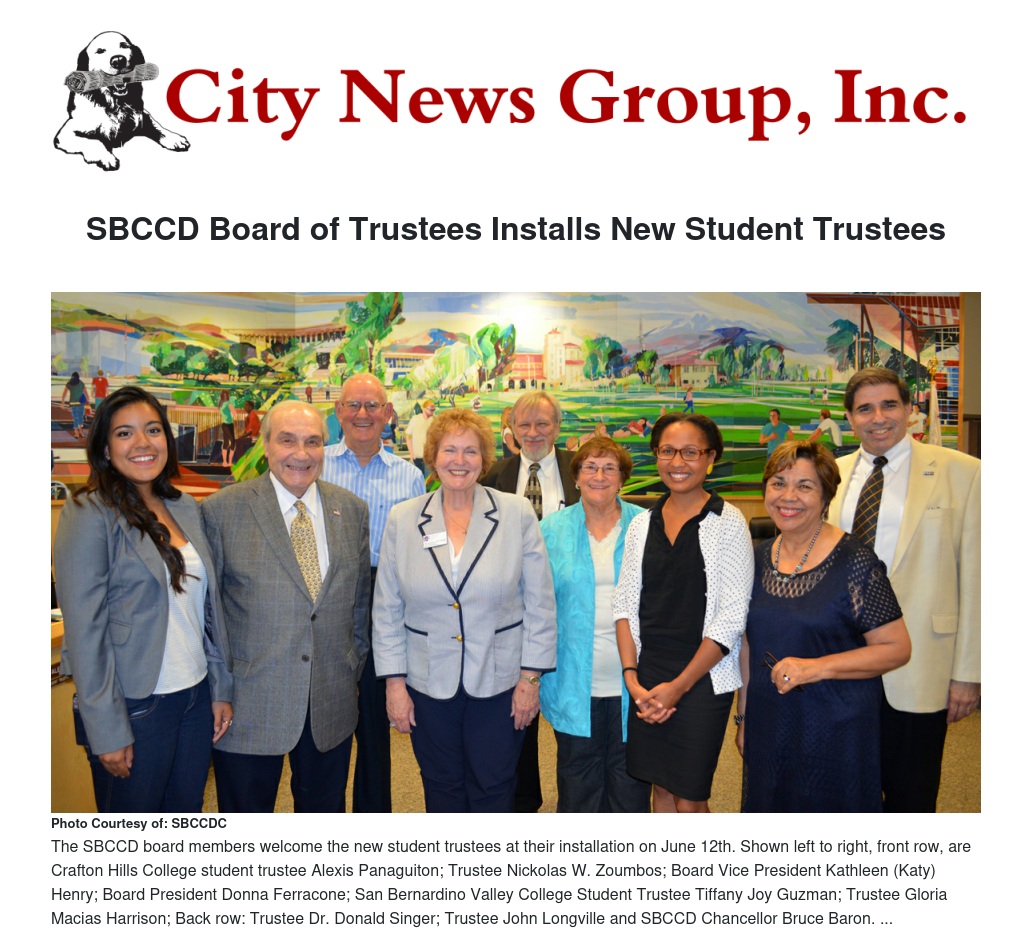 SBCCD Chancellor Bruce Baron said, “Previous student trustees have identified specific issues that their electorates were interested in, have researched those issues, and proffered policies and procedures that the Board has taken very seriously. We look forward to working with both Student Trustees and to providing them with a rewarding learning experience.”