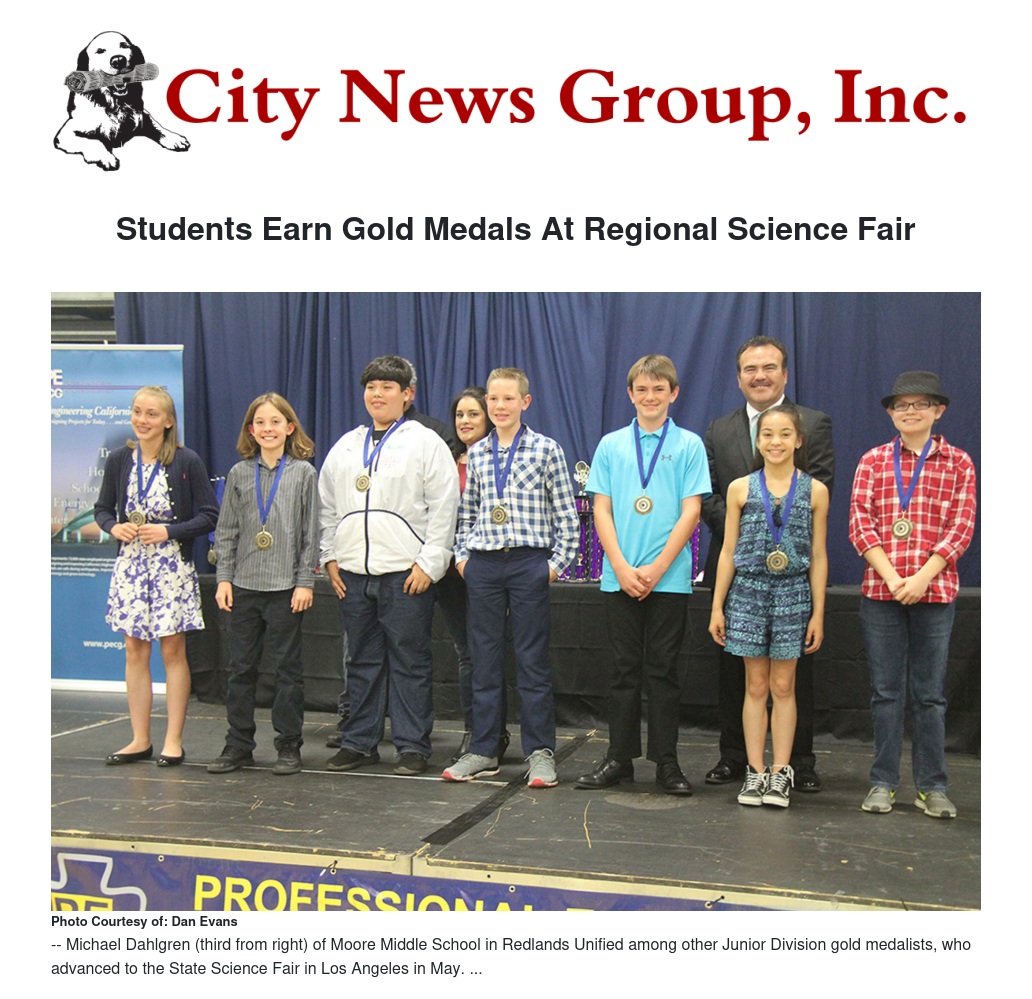 The students from the three-county region were among 373 projects from approximately 450 students in San Bernardino, Inyo and Mono counties that competed at the event. Summit High School in the Fontana Unified School District hosted the award ceremony. The gold-medal recipients were in three categories: Elementary, Junior and Senior divisions. Only the Junior and Senior projects advance to California State Science Fair, which will be held in Los Angeles in May.