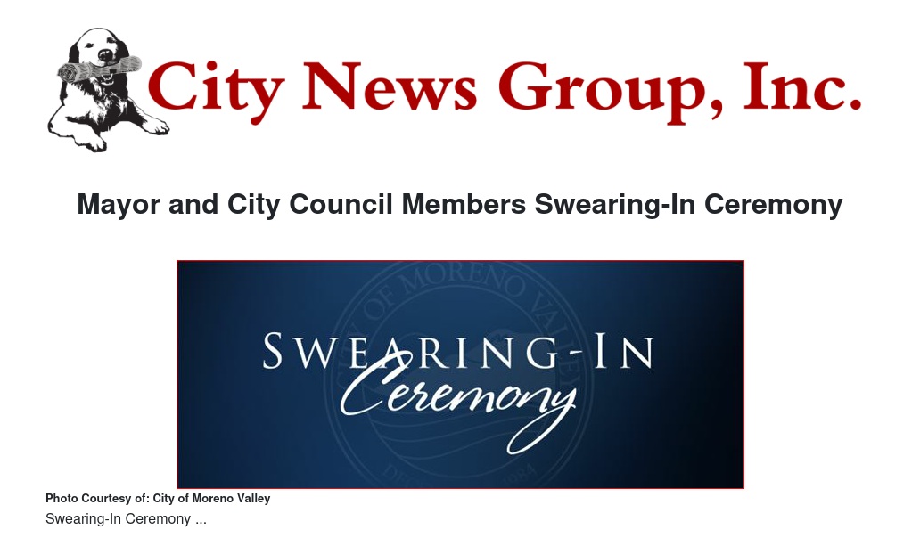 Moreno Valley residents are invited to attend the ceremony, which takes place Tuesday, December 10, at 6 p.m. at City Hall Council Chambers, located at 14177 Frederick Street. For more information about the Swearing-In Ceremony, contact the Moreno Valley City Council Office at 951.413.3008.