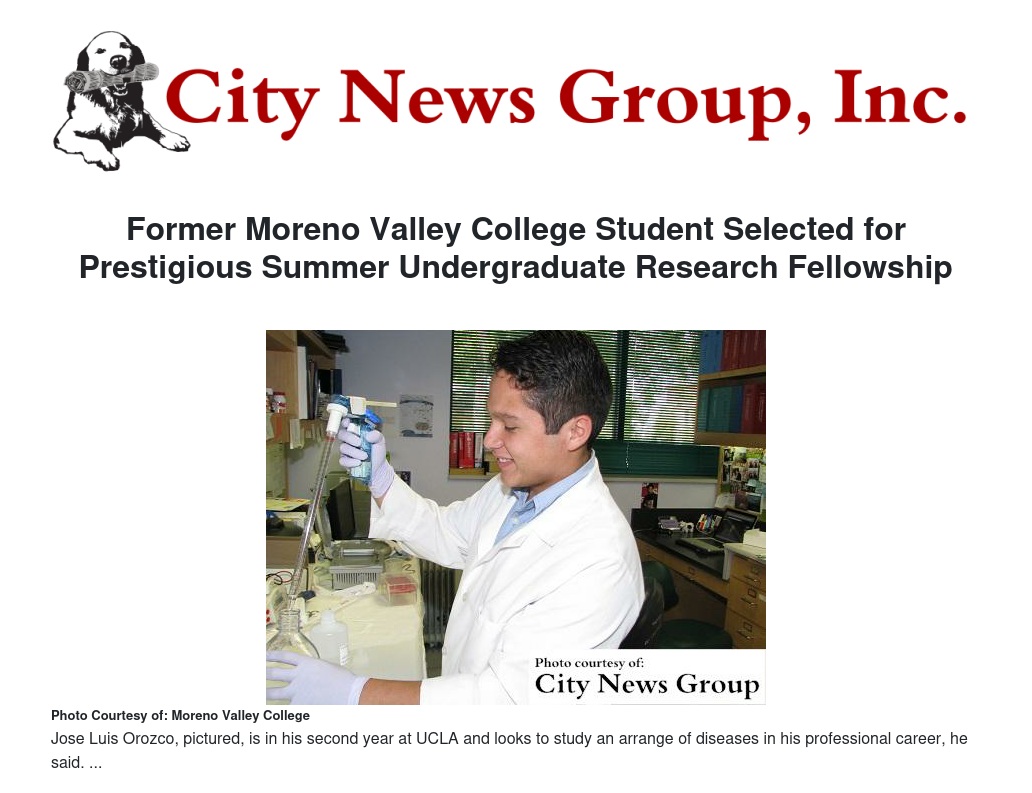 Jose Luis Orozco, a graduate of Moreno Valley College's Nuview Bridge Early College High School program, has been selected to participate in undergraduate research into cures for kidney disease at the University of Texas.