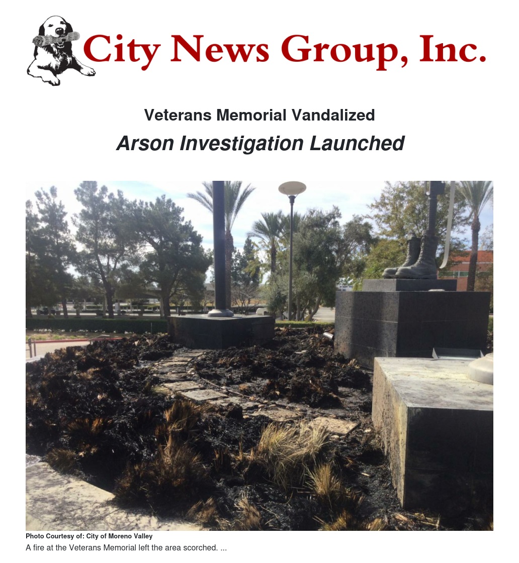 The City of Moreno Valley and Riverside County have launched an arson investigation after the Veterans Memorial at the Moreno Valley Civic Center was vandalized early Saturday morning.