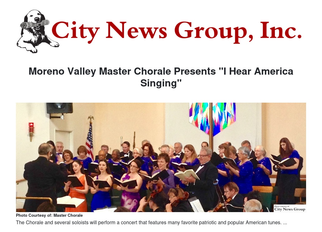MORENO VALLEY>> On Sunday, June 4 T Master Chorale will present: “I hear America Singing” at the the Shepherd of the Valley Lutheran Church, located at 11650 Perris Boulevard, in Moreno Valley, CA 92557.