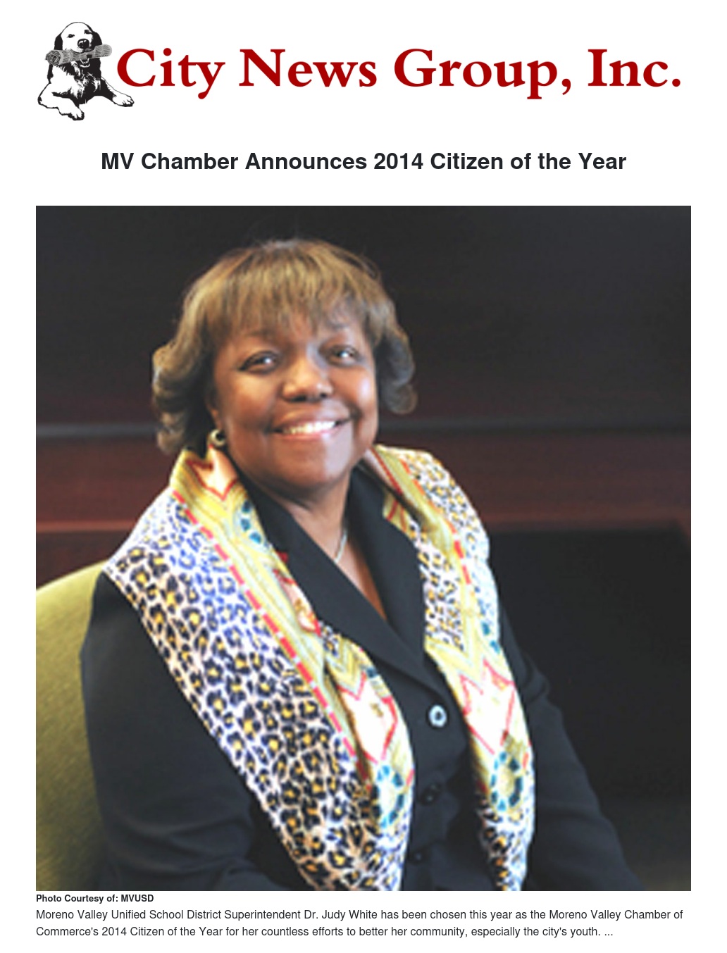 The Moreno Valley Chamber of Commerce announced its 2014 Citizen of the Year, Dr. Judy D. White.