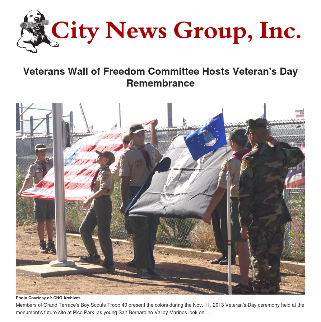 Welcomed at the event were residents, veterans, Veterans Wall of Freedom committee members, and local leaders including Mayor Walt Stanckiewitz, Council Member and Foundation of Grand Terrace President Darcy McNaboe, and Council members Sylvia Robles and Jackie Mitchell. The Grand Terrace Boy Scouts Troop 40 and San Bernardino Valley Young Marines performed several short ceremonies, including the presentation of the colors, the flying of the colors, leading the audience in the Pledge of Allegiance and the laying of the wreath.