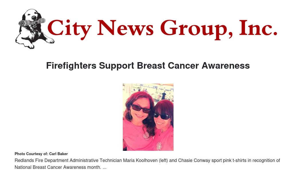 This marks the fifth year Redlands Firefighters have worn pink t-shirts through the month of October. Each year the Redlands Firefighters Association purchases the pink t-shirts with money donated from members. All profits from the sales of the t-shirts go directly to the Stater Bros. Charities and Inland Women Fighting Cancer.