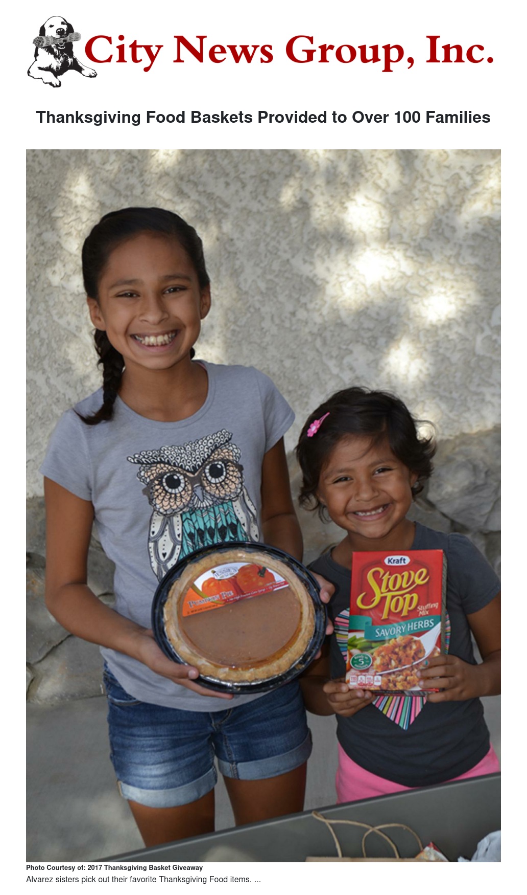 Baskets were provided by various donors: San Bernardino Municipal Water Department Employees Association, Allstate Diamond Bar Express, Bake Me Beautiful - Tamara Obregon, Beaver Medical Group – Highland, Scottish Society IE, City of San Bernardino Finance Department, Ferrer Family, County of San Bernardino Redlands, City of San Bernardino City Clerk's Office, LLU International Patient Services, City of San Bernardino Business Registration, Elena Klopfer, Ana Lugo, National Charity League, and Lisa Bates & Friends. Donors collected food for the giveaway and delivered baskets the morning of November 21st in time for families to pick up their much needed meals for the Thanksgiving holiday.