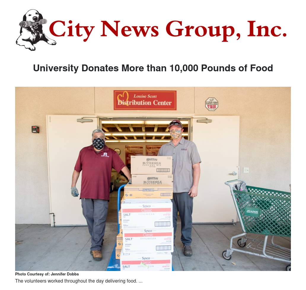 The University of Redlands also donated food to Inland Harvest, a Redlands-based organization that feeds hungry people by transporting donated surplus food to established nonprofit feeding programs in the Inland Empire. About 3,000 pounds of food — 80 boxes of protein bars and 480 cans of food — will be distributed to the homeless and families in need throughout San Bernardino and Riverside counties.