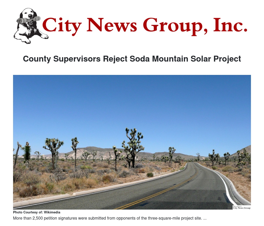 County Supervisors Reject Soda Mountain Solar Project