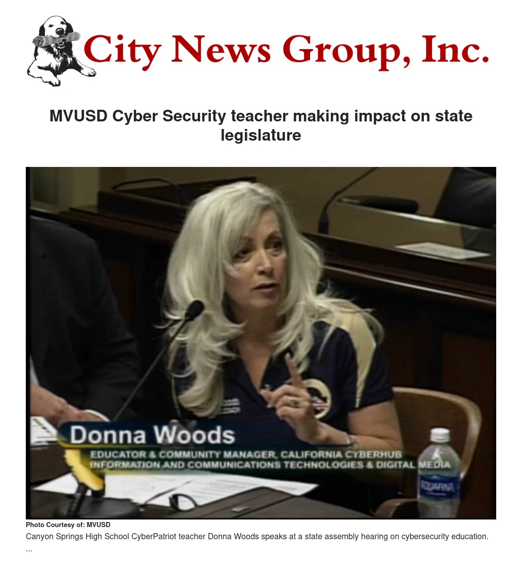 As we have shared before, our Moreno Valley Unified School District CyberPatriot teams have received a lot of accolades over the past year. Recently, one of MVUSD’s cybersecurity program teachers, Donna Woods, from Canyon Springs High School, testified before the State Assembly Joint Oversight Committee for a hearing titled "Cybersecurity Education and the Needs of the Workforce."