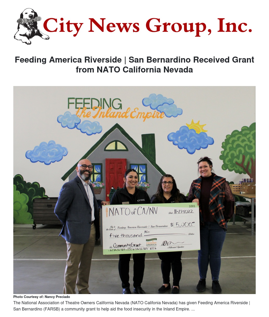 Feeding America Riverside | San Bernardino (FARSB) was selected as one of the 20 Feeding America food banks that received a $5,000 community grant earlier this year by the National Association of Theatre Owners California Nevada (NATO California Nevada). These grants were designed to support a variety of arts and social service organizations.