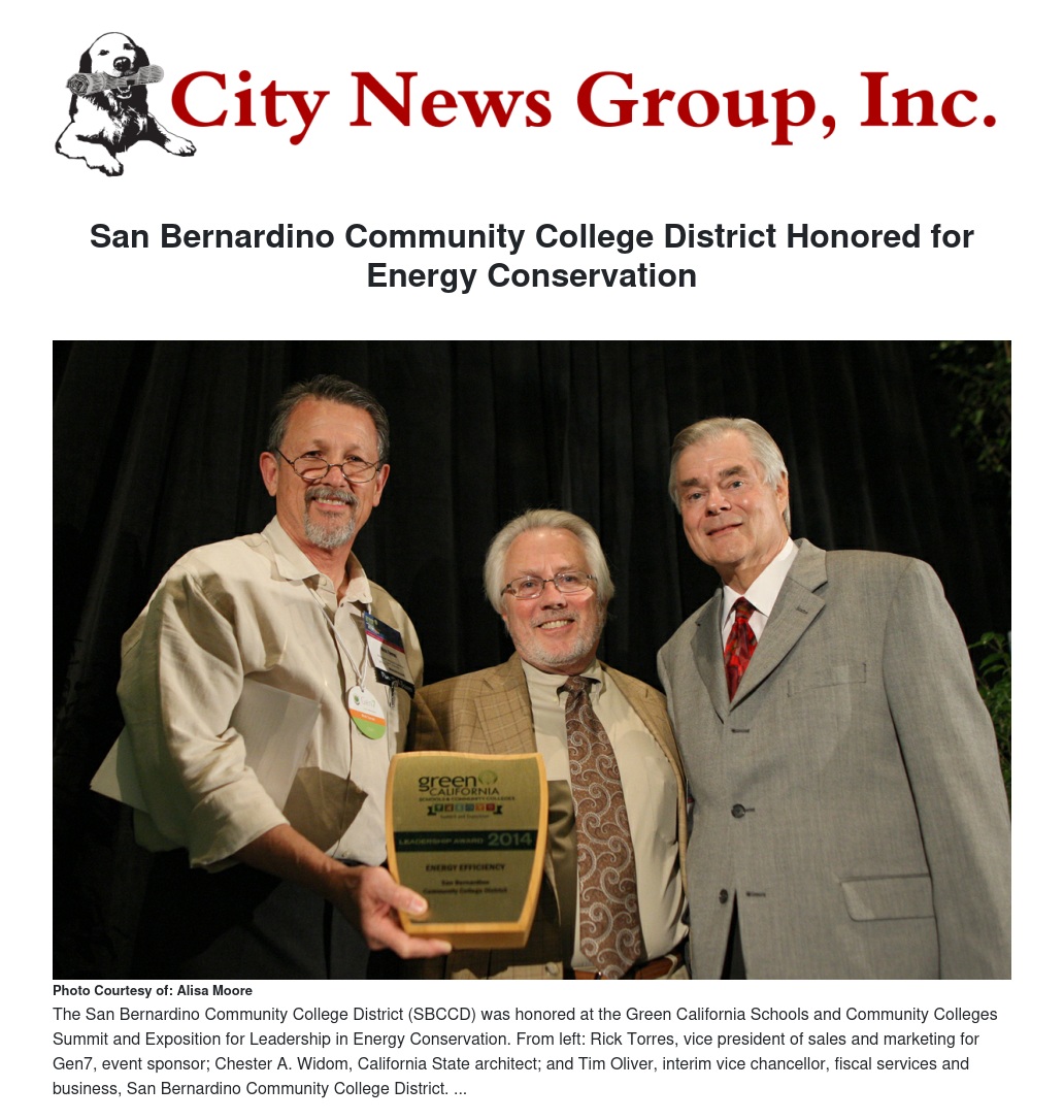 The San Bernardino Community College District (SBCCD) was recognized for Leadership in Energy Conservation at the 2014 Green California School and Community Colleges Summit and Exposition in Pasadena last month.