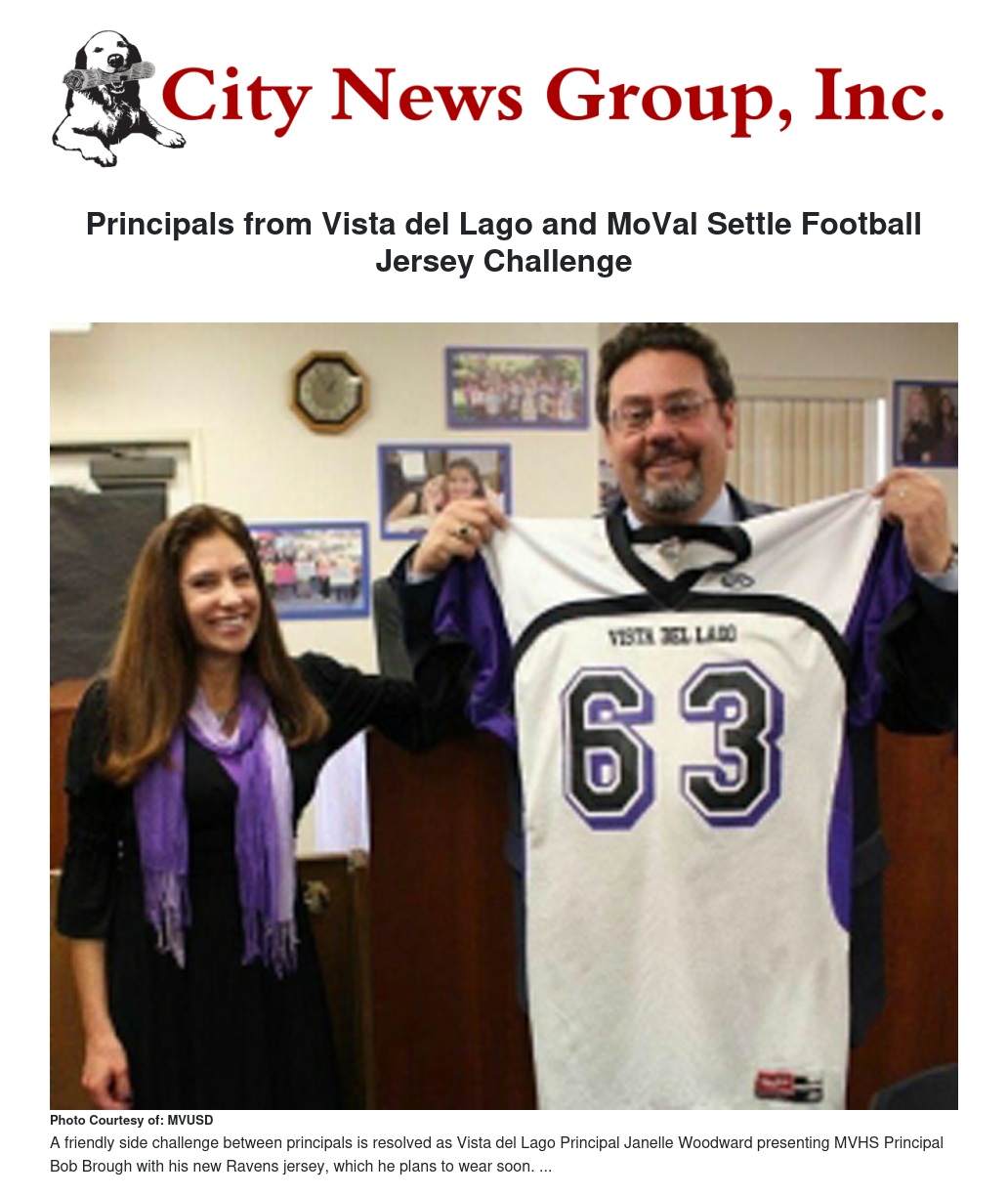 The principal whose team came out on the short end would wear the other team's jersey for a day. The Ravens came out on top, so Vista del Lago Principal Janelle Woodward presented Moreno Valley High School Principal Bob Brough with his new Ravens jersey, which he plans to wear soon.