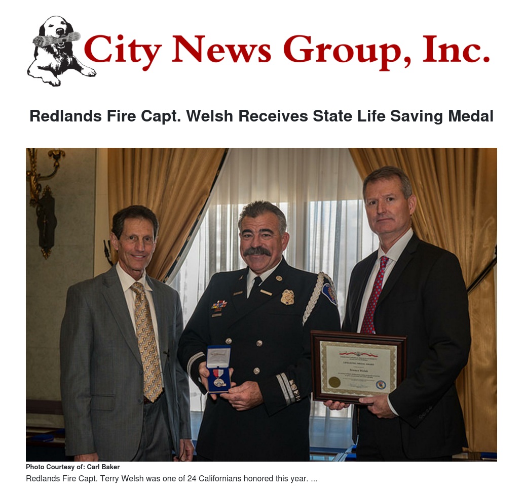 Redlands Fire Capt. Welsh Receives State Life Saving Medal by Carl Baker - City News Group, Inc.