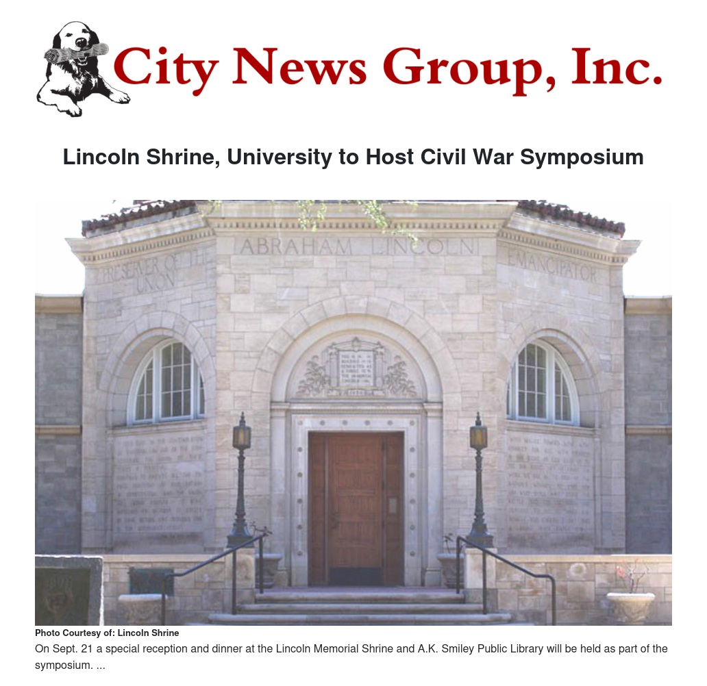 The two-day event will take place Saturday, Sept. 21, and Sunday, Sept. 22, at the University of Redlands Casa Loma Room, with a special reception and dinner on the evening of Sept. 21 at the Lincoln Memorial Shrine and A.K. Smiley Public Library in Redlands. Founded in 1932, the Lincoln Memorial Shrine is the only museum in the West dedicated to Abraham Lincoln and the Civil War.