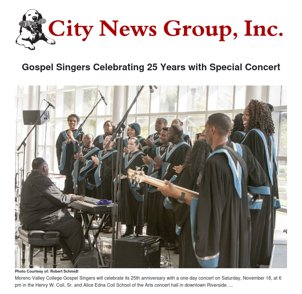 Moreno Valley College Gospel Singers will celebrate its 25th anniversary with a one-day concert on Saturday, November 18, at 6 pm in the Henry W. Coil, Sr. and Alice Edna Coil School of the Arts concert hall in downtown Riverside.