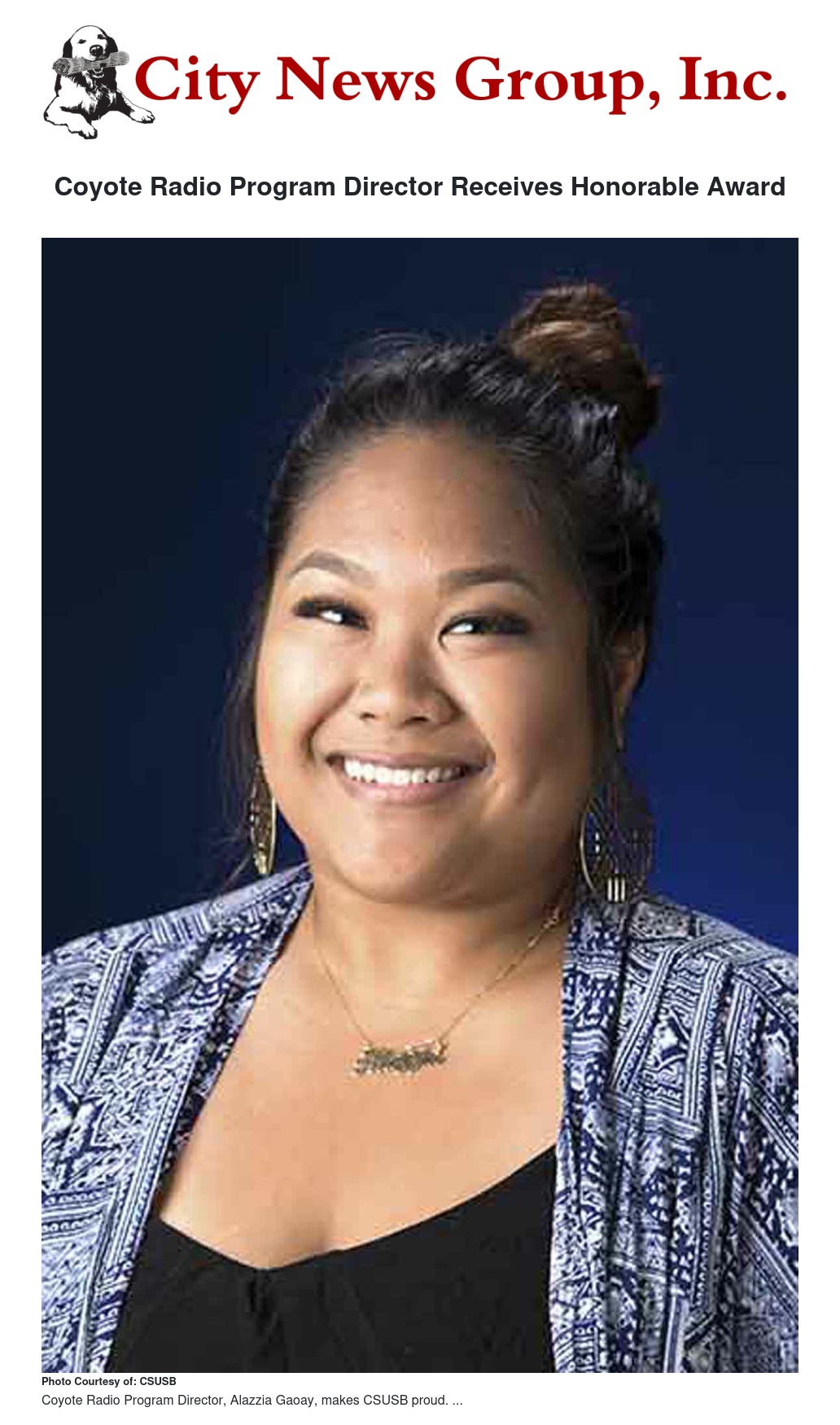 California State University, San Bernardino (CSUSB) student Alazzia Gaoay, who oversees Coyote Radio’s daily business operations among her many tasks as the station’s student program director, is the winner of the 2014 Fred Jandt Communicator Award.