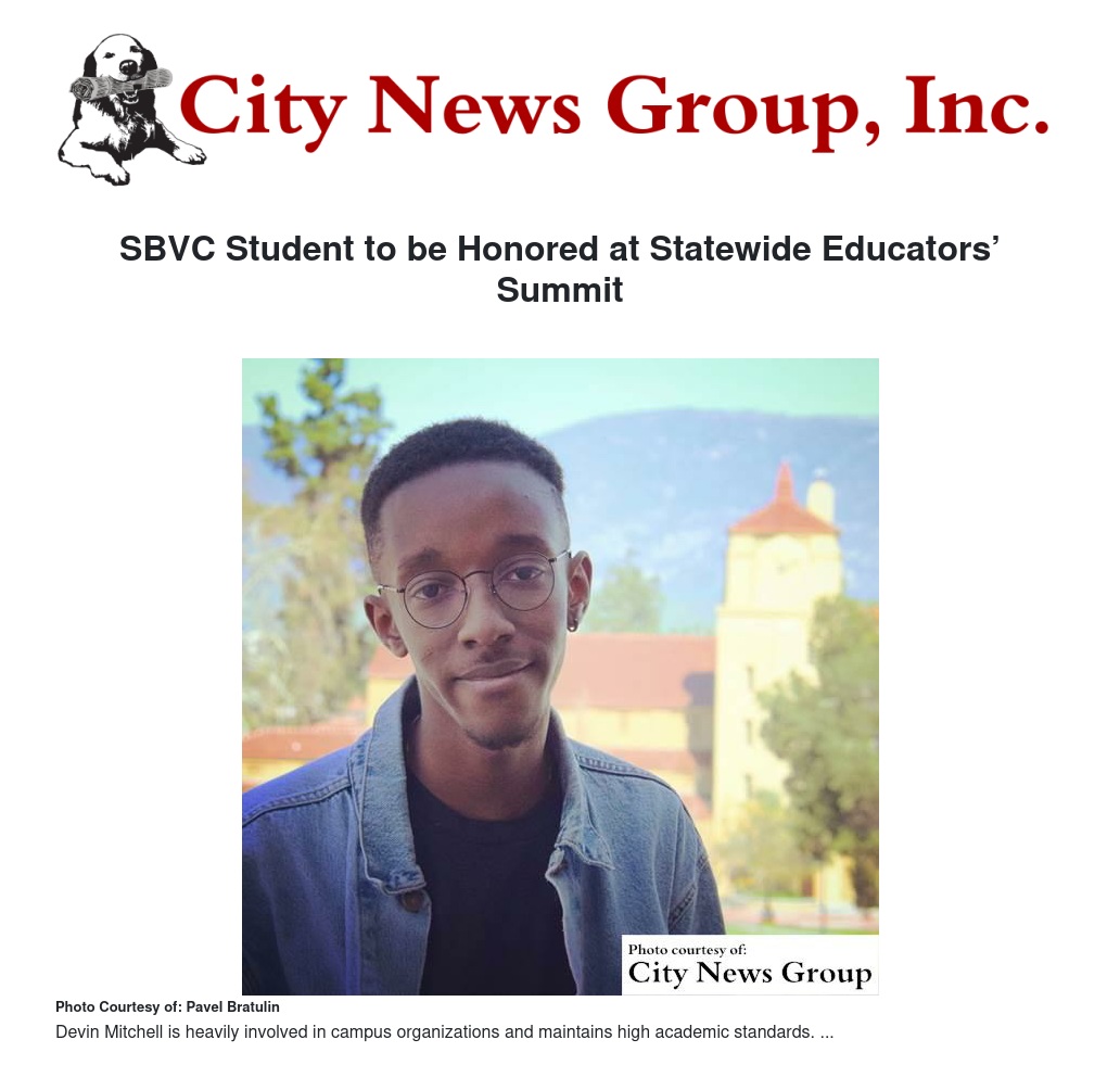 SBVC Student to be Honored at Statewide Educators’ Summit