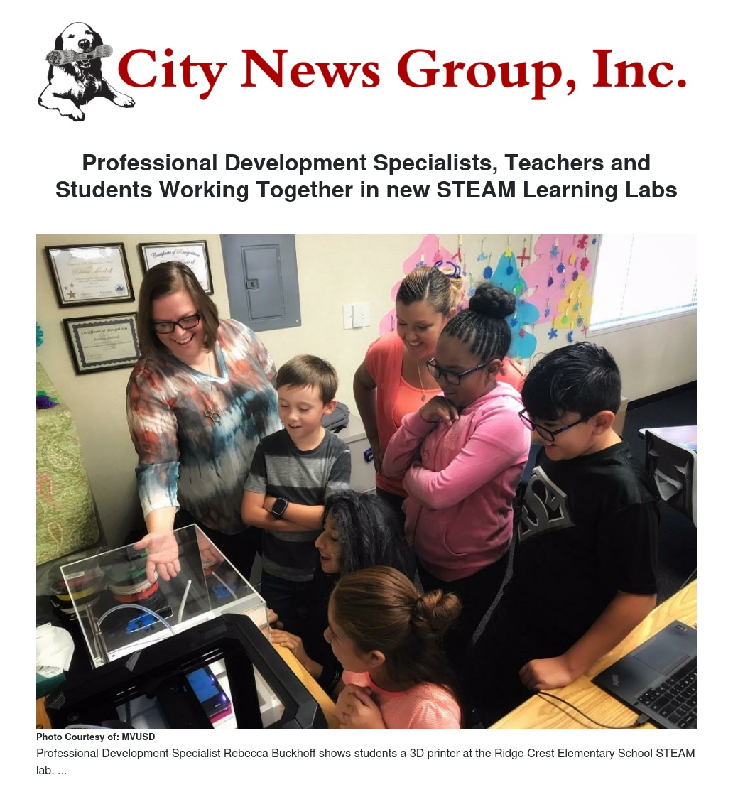 At Ridge Crest Elementary’s STEAM Learning Lab, teacher Mike Mandelbaum and Professional Specialist Rebecca Buckhoff are focused on 3D printing. “I’ve never witnessed students so motivated and inspired by what they learned,” Mandelbaum said.